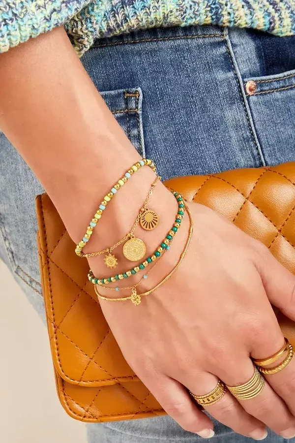 De armband heeft een super leuke hanger van een open klavertje en er zitten mooie gouden staafjes en zwarte kralen in verwerkt. Te combineren bij elke outfit dus !