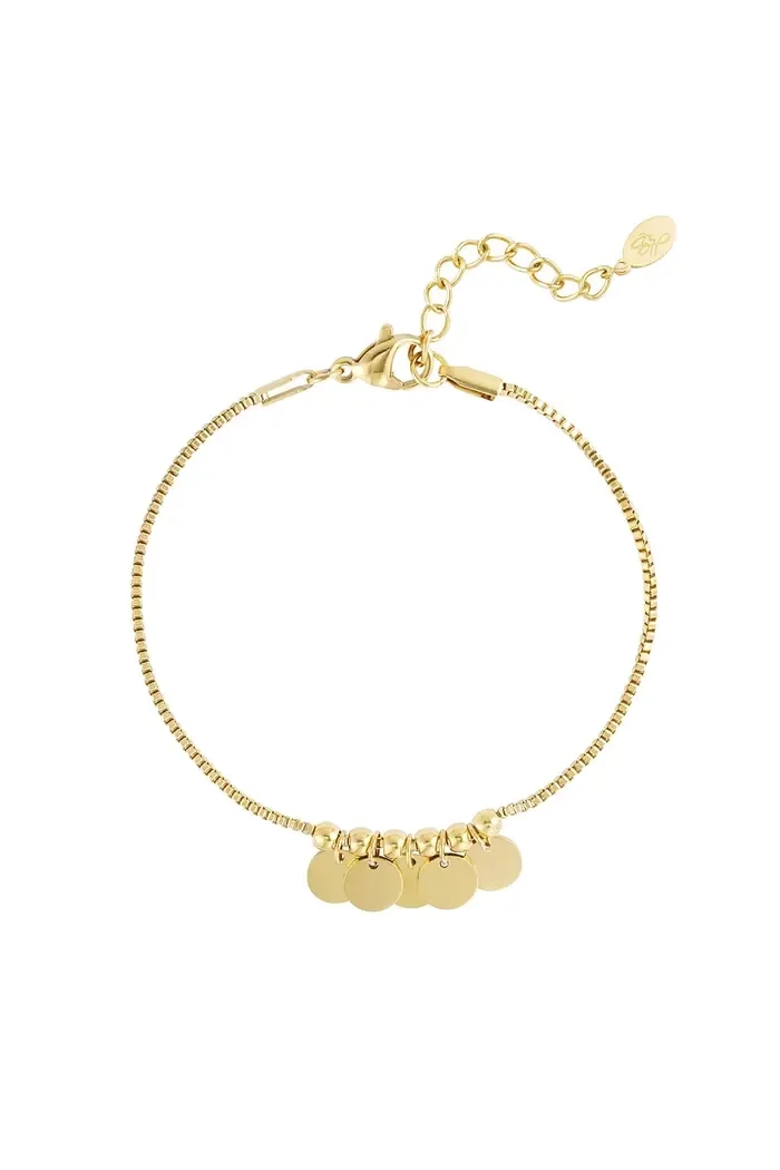 Shop nu dit te schattige gouden armbandje met minimalistische uitstraling en hangende coins bij Beau visage! Het armbandje is superleuk te combineren met meerdere schattige armbandjes maar kan ook perfect enkel gedragen worden. Tip: draag deze armband in combinatie met meerdere sieraden met leuke details voor een complete look. De armband is gemaakt van stainless steel en kan gedragen worden vanaf 16 tot en met 19 cm.