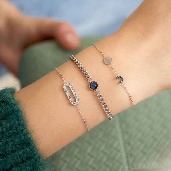 Roestvrijstalen armband met hanger in grote rechthoekige vorm met afgeronde hoeken. De hanger is ingelegd met kleine zirkonia steentjes.