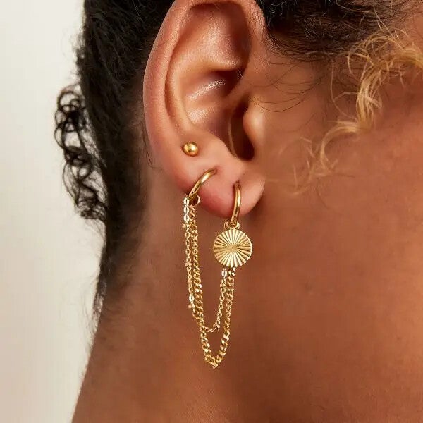 De oorbel bestaat uit twee ringen of één ring plus een speld die met elkaar verbonden zijn door een kettinkje.