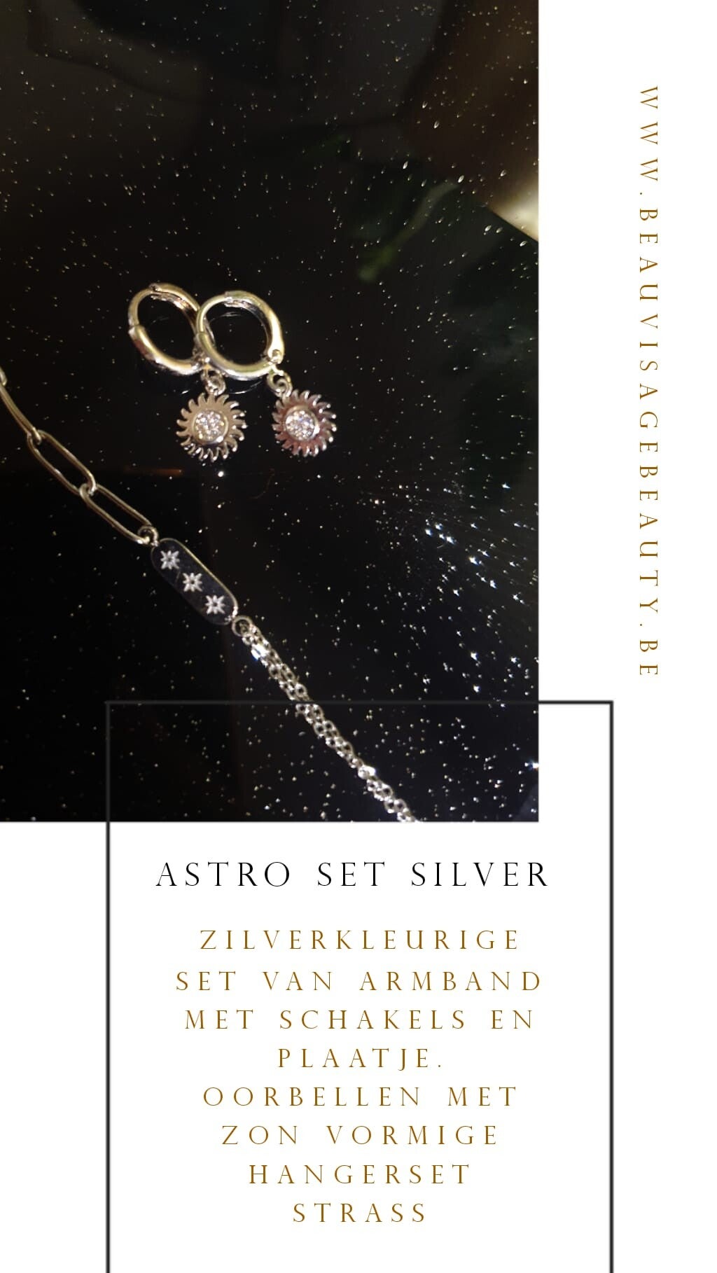 Mooie zilverkleurige set armbandje met verschillende schakels en plaatje , bijpassende oorbellen met hanger.